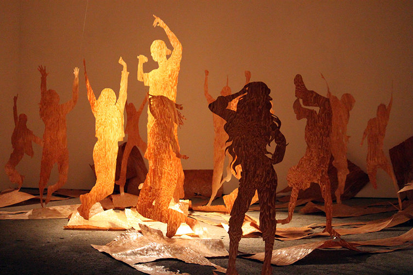 インスタレーション作品《Tree of Life (Party)》では、調光装置によって光の当たる位置がゆっくりと変化し、彫刻のシルエットが浮かび上がったり、影に沈んだりを繰り返す。その光と影の変化が、木の薄さと杢目の美しさを絶えず新しい形で映し出し、鑑賞者に木が呼吸しているかのような感覚を与える。